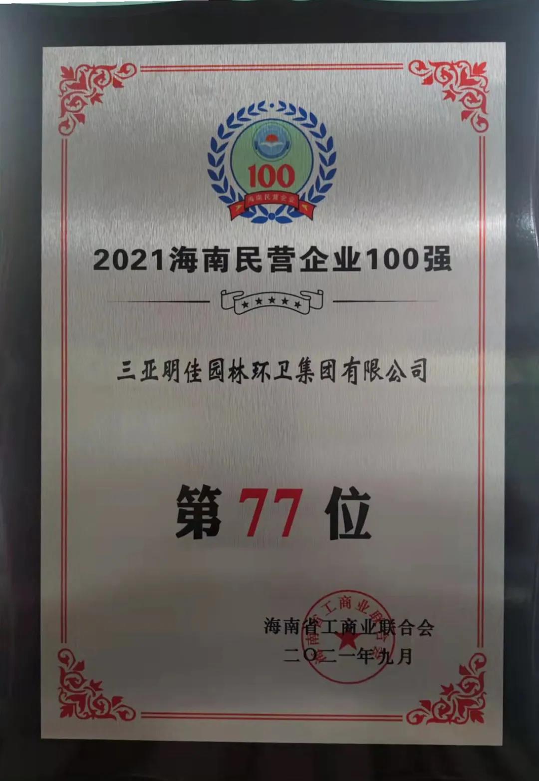 11月4日,海南省工商業(yè)聯(lián)合會(huì)在海口發(fā)布“2021海南民營(yíng)企業(yè)100強(qiáng)”榜單。三亞明佳園林環(huán)衛(wèi)集團(tuán)有限公司2019至2021年連續(xù)三年入選海南民營(yíng)企業(yè)100強(qiáng)。